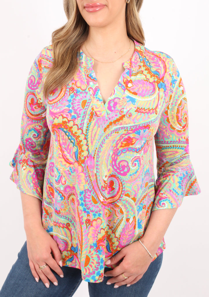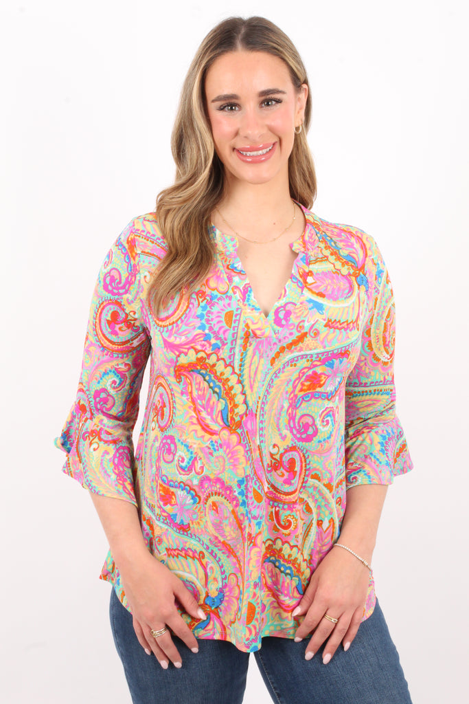 Effortlessly stylish and practical, our Peyton Paisley Blouse features a flattering v neckline and playful 3/4 sleeves with ruffle details. The vibrant paisley print adds a pop of color to any outfit. Made with wrinkle-free fabric, it's perfect for on-the-go!