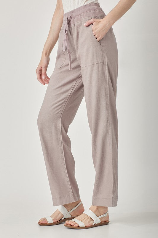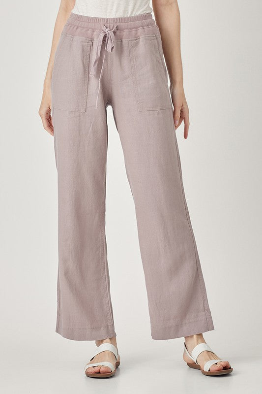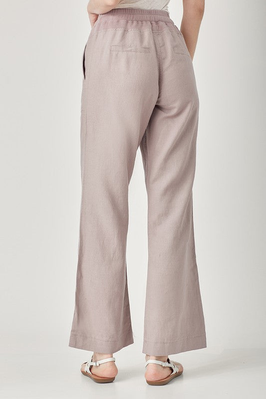 Look effortlessly chic in these classic linen wide leg pants! Boasting ribbed elastic band detailing and a tie waist for a personalized fit, these pants also feature two front pockets for added convenience. Crafted from breathable, lightweight linen material, it's hard to go wrong with this timeless piece. Perfect for the office or any other occasion!
