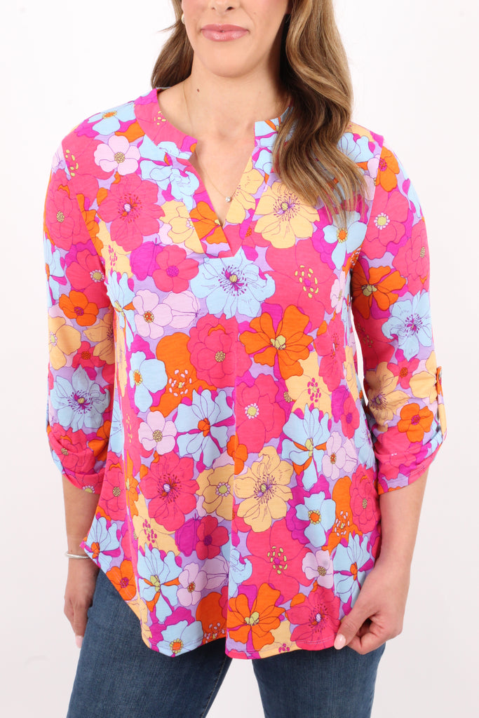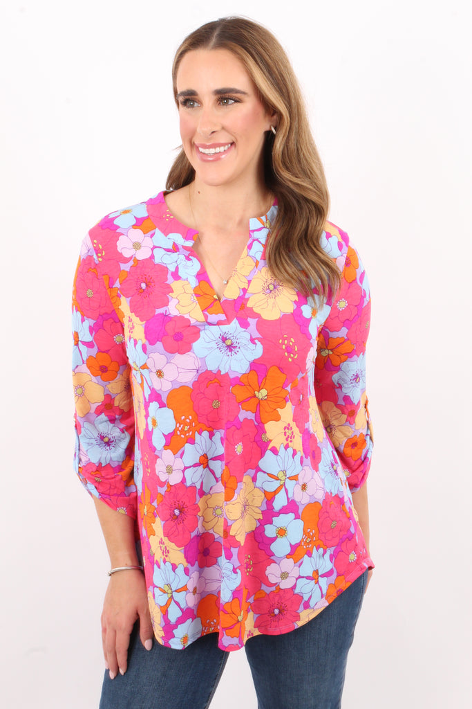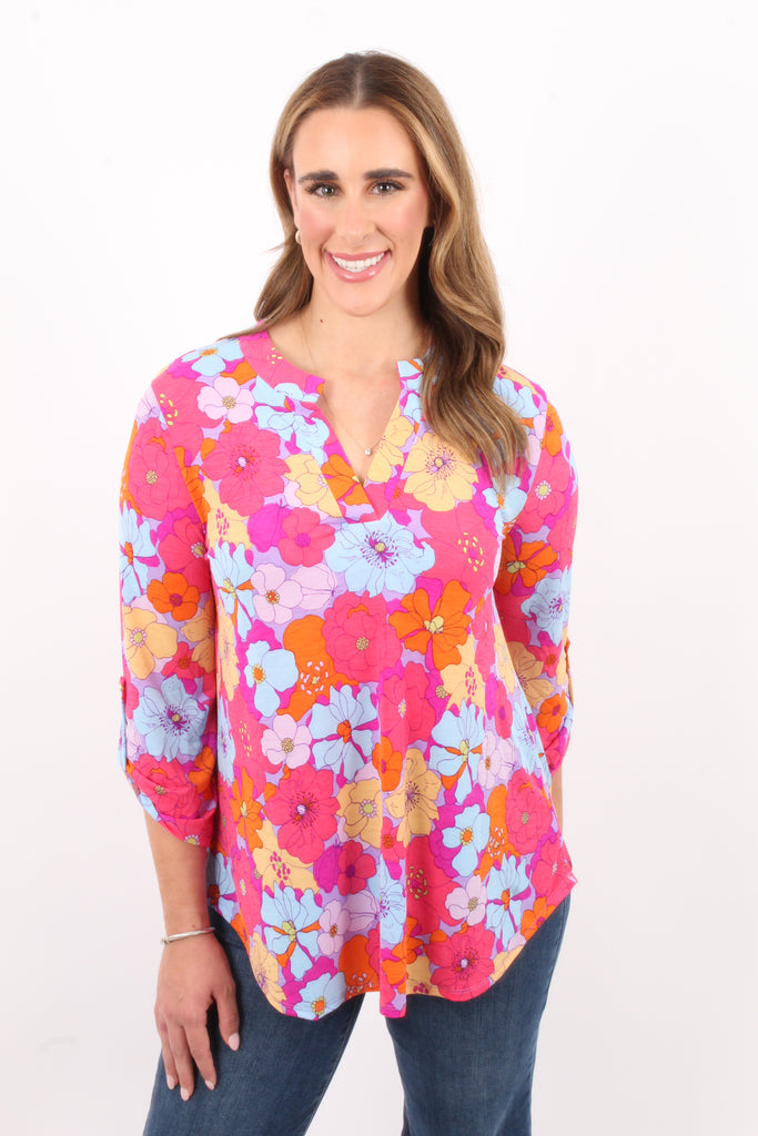 Introducing the Flower Power Top! This stylish top features a flattering v neckline and a colorful flower print, perfect for adding a pop of color to any outfit. The 3/4 sleeve with button detail and round hem add a touch of elegance, while our wrinkle free fabric ensures you'll always look your best!