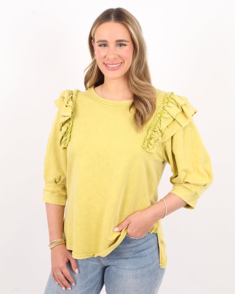 Upgrade your casual wardrobe with our Avocado French Terry Ruffle Top. The soft french terry material ensures all-day comfort, while the ruffle sleeve detail adds a touch of femininity. With 3/4 sleeve length, split hem and a round neckline, this top is perfect for any occasion!