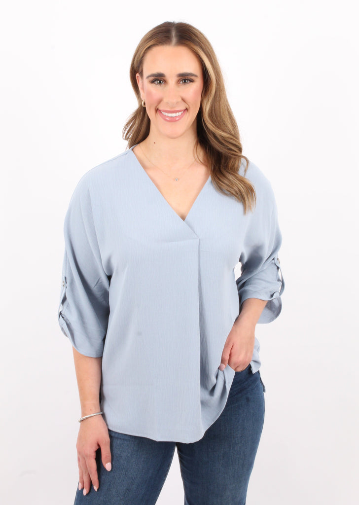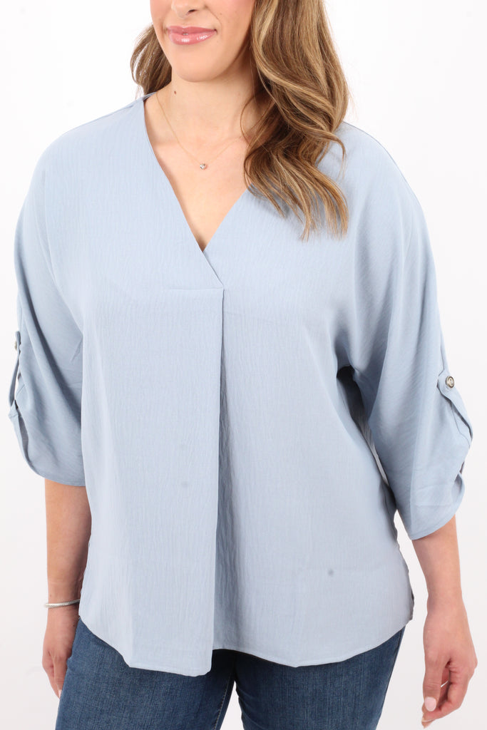 This Chambray Rolled Sleeve Top features a V Neck design and rolled sleeve button detail, providing a sophisticated and versatile style. With its comfortable fit and elegant details, it is perfect for both professional and casual occasions. Elevate your wardrobe with this timeless top!