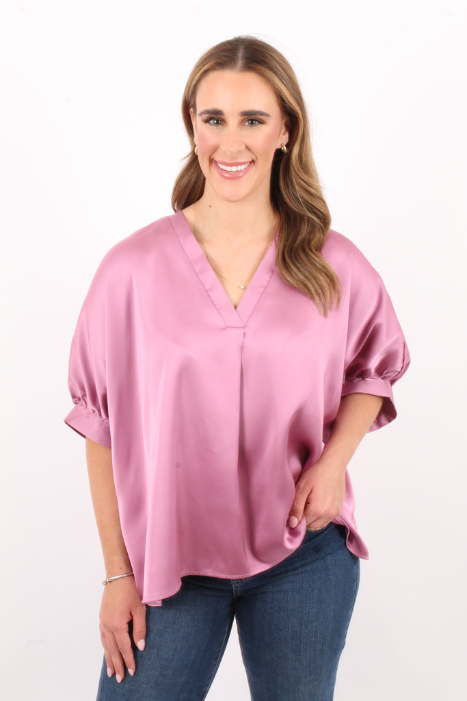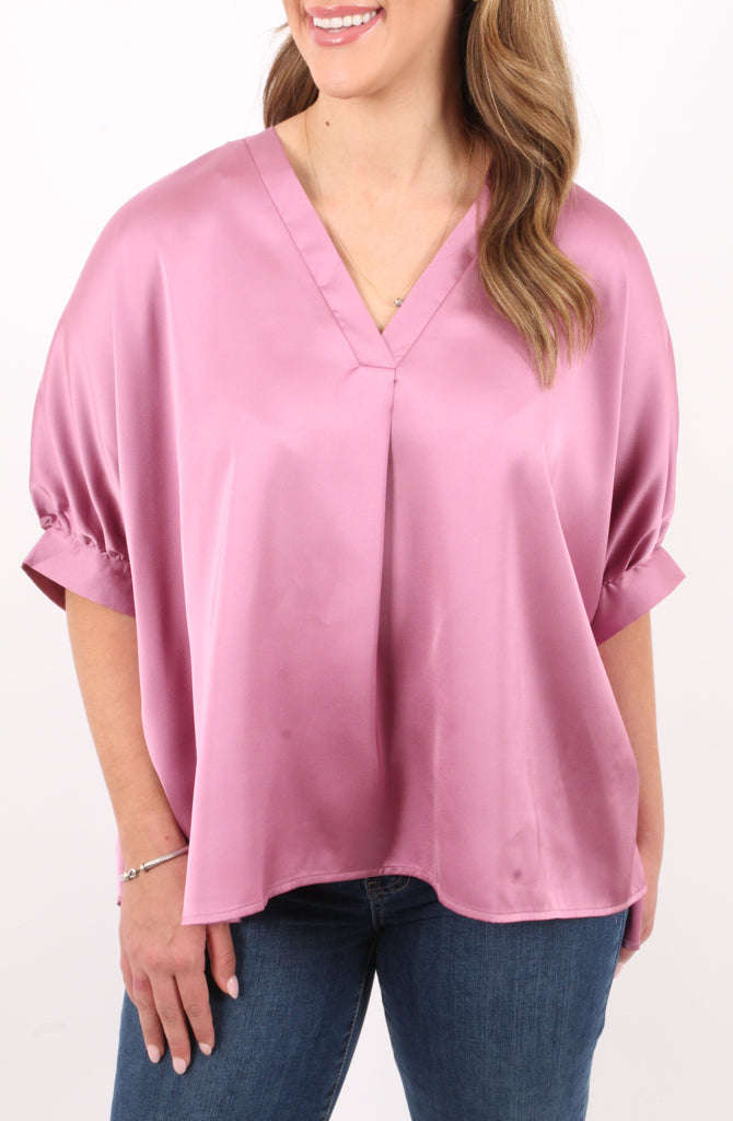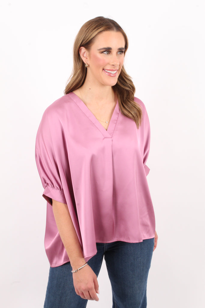 The Mia Mauve Satin Top is the perfect blend of elegance and comfort. Featuring a flattering v neckline, 3/4 sleeves, and a round hem, this top is made with a satin-like fabric that will make you feel effortlessly chic. Upgrade your wardrobe with this must-have piece that will elevate any outfit!