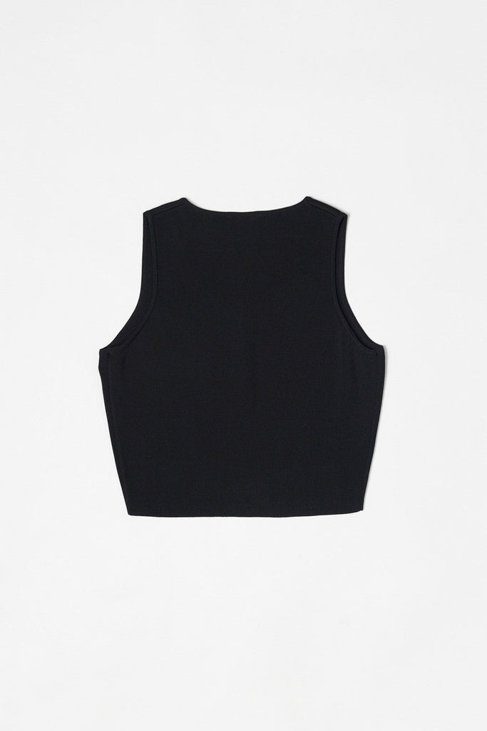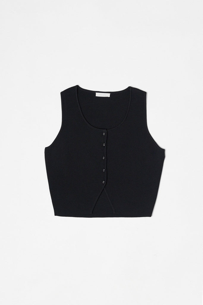 Stay stylish in the Sabrina Top! This chic knit vest features a scoop neck and cropped length for a modern look. An open button-down V-design adds an elevated touch. Perfectly pair it with your favorite trousers for a sophisticated ensemble.